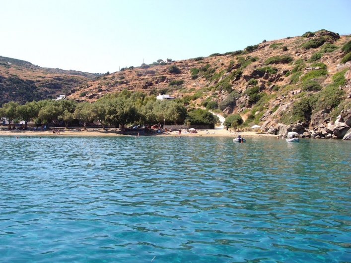Αμμώδης παραλία με πεντακάθαρα γαλαζοπράσινα νερά και αλμυρίκια. Βρίσκεται ανατολικά της εκκλησίας της Χρυσοπηγής.