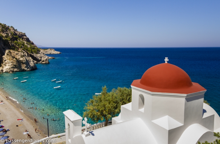 Ακρως εντυπωσιακό τοπίο, πανέμορφη παραλία, καταγάλανα αστραφτερά νερά, ψιλή λευκή άμμος και βότσαλα. Η όμορφη παραλία της Κυρα-Παναγιάς βρίσκεται σε έναν όρμο, όπου από τη μία πλευρά ορθώνονται σχεδόν κάθετα τα πανύψηλα βράχια και από την άλλη βρίσκεται το εκκλησάκι της Κυρα-Παναγιάς, στο οποίο οφείλει και το όνομά της. Βρίσκεται ανατολικά του νησιού, 19 χλμ. από τα Πηγάδια και είναι κοντά στη γνωστότερη Απέλλα.