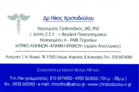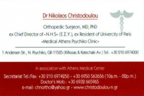 The Clinic of orthopedic Nicholas Christodoulou, provides patients of orthopedic high quality services for diseases of the joints, with particular expertise in hip and knee in a friendly environment. The satisfaction of patients and their speedy return to full activity is the goal of all our treatments.